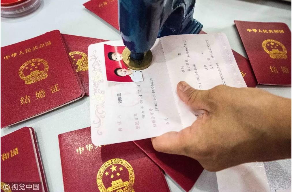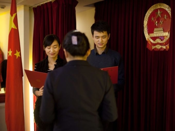 Một cặp vợ chồng đọc lời thề khi làm thủ tục đăng ký kết hôn ở Bắc Kinh năm 2012. Ảnh: AFPGiấy kết hôn của Trung Quốc: