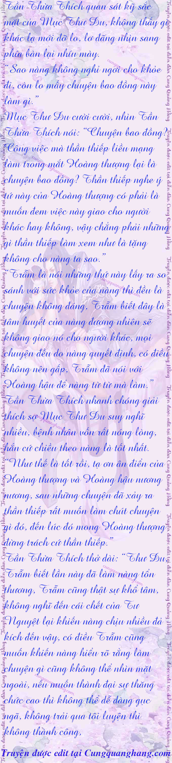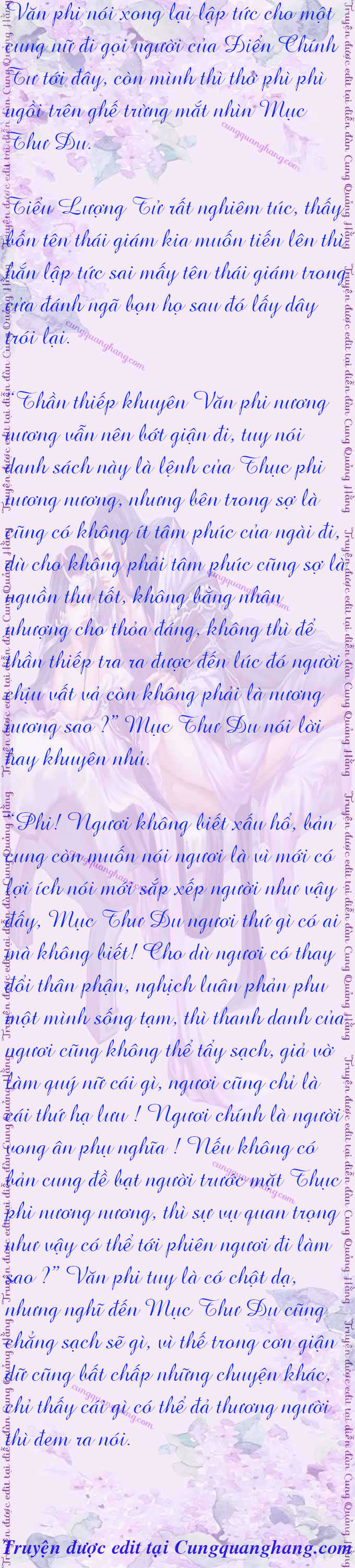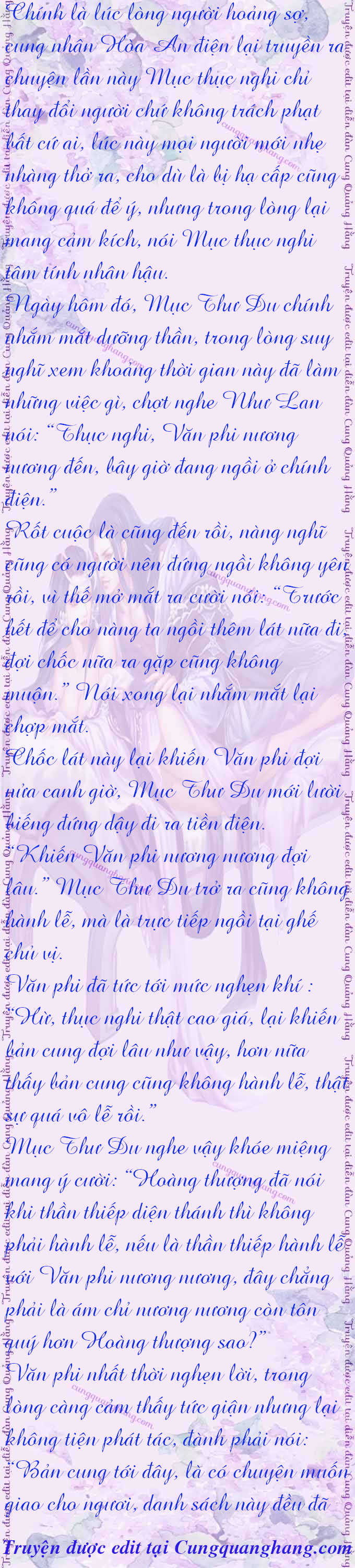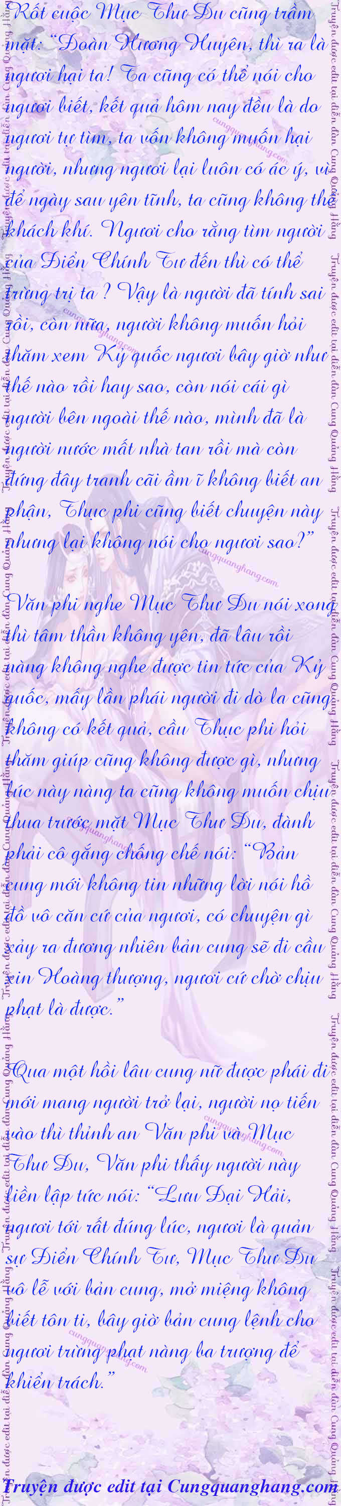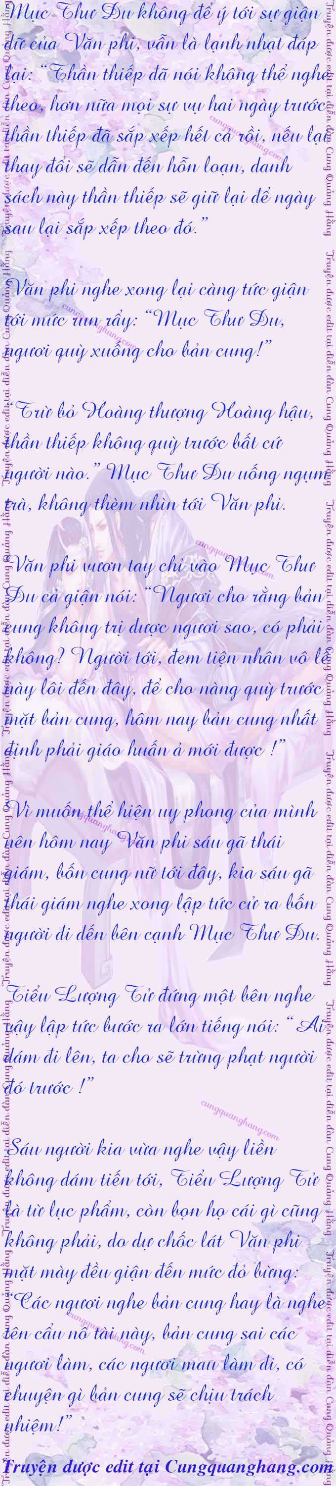 Mấy ngay nay vẻ mặt Mục Thư Du luôn lạnh nhạt rốt cuộc hôm nay sau khi nghe lời nói của Tần Thừa Thích cũng xuất hiện chút dao động, cuối cùng thì là mất bình tĩnh: Hoàng hậu rốt cục cũng muốn tự mình ra tay đối phó nàng sao? Chỉ là lấy Phúc Hân ra làm cái cớ không khỏi có chút quá phận!