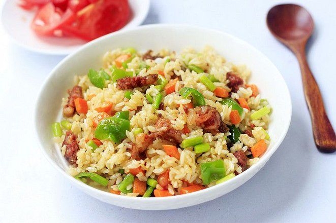 Cơm để rang tốt nhất nên dùng cơm đêm qua, Cao Trản lấy cơm ra khỏi tủ lạnh, đổ vào nồi, dùng thìa gỗ xới hai lần cho cơm tơi ra.