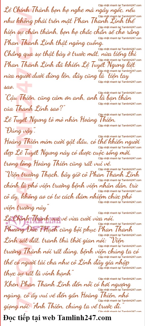 Hoàng Thiên thu lại ngân châm rồi giao vào tay Phan Thanh Linh. “Anh Thiên, vậy em đi giúp cô Ngưng chữa trị” Phan Thanh Linh nói với Hoàng Thiên. Hoàng Thiên gật đầu, Phan Thanh Linh đẩy Lê Tuyết Ngưng tới phòng làm việc của viện trưởng rồi đóng kỹ cửa. Nhìn thấy Phan Thanh Linh nắm chắc như vậy, những người kia bao gồm Lê Chính Thành dẫn đầu đều sợ hãi thán phục.