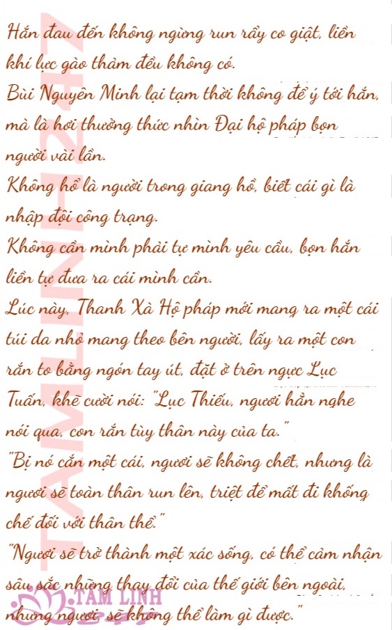 Ngay sau đó, Phương Kính Đường cùng Thanh Xà Hộ pháp, cũng học theo, đánh gãy hai tay Lục Tuấn.