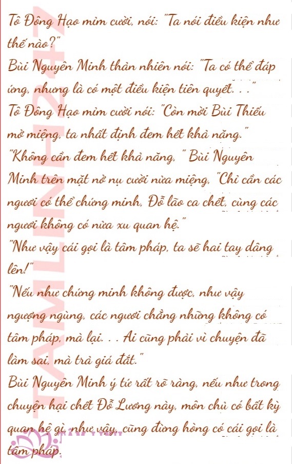 Bùi Nguyên Minh thản nhiên nói: “Môn chủ ngược lại là người biết chuyện, dám nói ra Thiên Môn Trại, chưa từng có cái gọi là tâm pháp Thiên Môn Quyền, ta rất coi trọng ông ấy.”