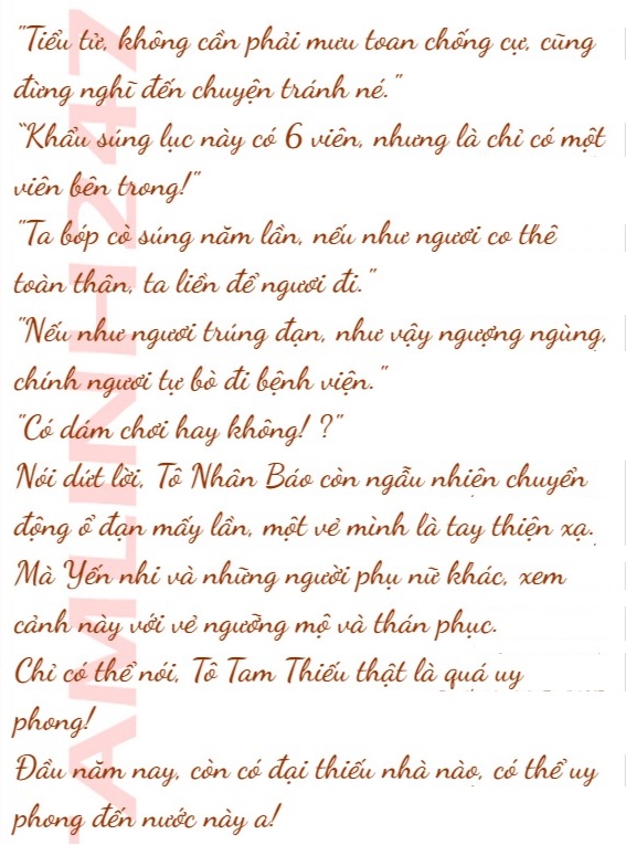 Tô Nhân Báo vứt xuống điếu xì gà ở trong tay, tùy ý cầm lấy khẩu súng lục bàn trên bàn đá cẩm thạch, sau đó họng súng xê dịch, nhắm ngay tay trái Bùi Nguyên Minh.