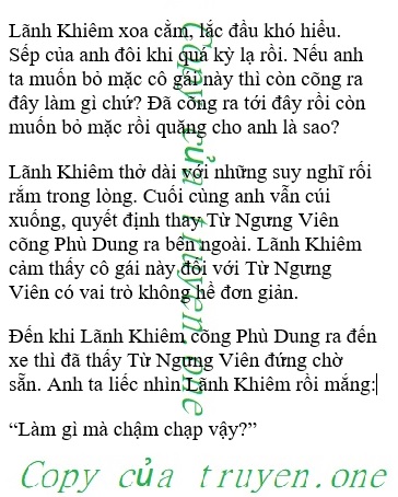 Sau đó Từ Ngưng Viên lạnh lùng leo lên xe ngồi. Lãnh Khiêm chưng hửng. Anh đã làm gì mà bị sếp ghét rồi?