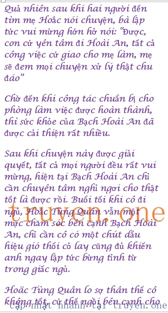 đến khi cô hoàn toàn chìm trong giấc ngủ anh mới nhẹ nhàng thở ra, sau khi để lại một nụ hôn lên trán của cô, anh mới nhắm mắt đi ngủ.