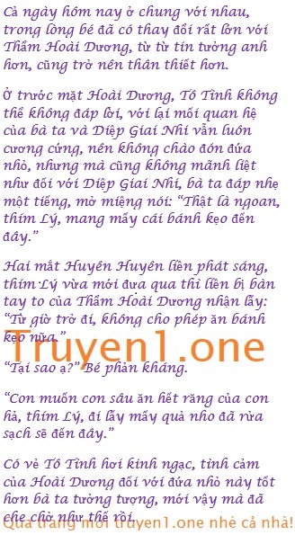 “Về khách sạn rồi, ngày mai sẽ đến đây với con.” Vẻ mặt hòa hoãn, giọng nói của Thẩm Hoài Dương mềm mại hơn, ôm cơ thể nhỏ bé của cô bé đặt trên đùi mình: “Gọi bà đi.”