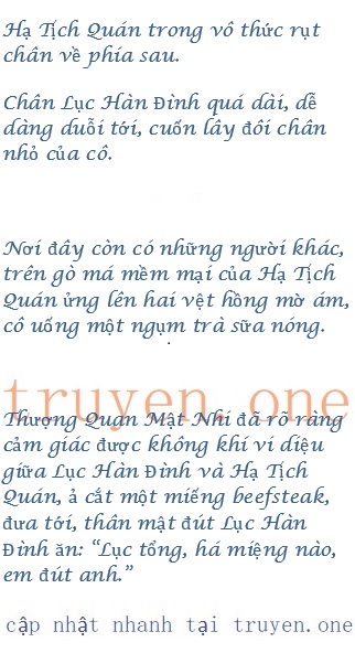 Thượng Quan Húc vẫn ngồi bên cạnh anh, nhưng có khăn trải bàn dài che, Lục Hàn Đình duỗi tay xuống phía dưới, bắt được đôi chân cô.