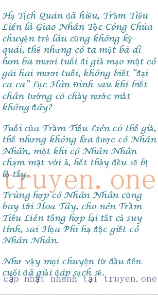 Trong phòng an tĩnh, Tình Nhi đi tới bên người Hạ Tịch Quán: “Công Chúa, hiện tại xem ra Trầm Tiểu Liên chính là Giao Nhân Tộc Công Chúa!”