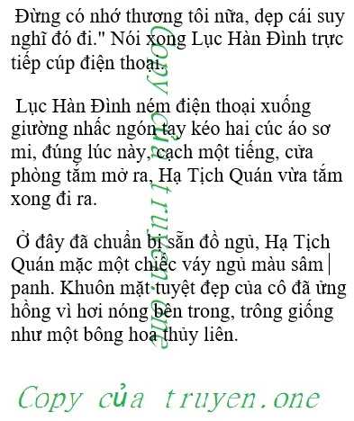 LÚC tổng, vậy anh thừa nhận đi, anh vẫn chưa quên, suốt những năm này anh vẫn nhớ mãi không quên em mà, trong lòng anh có vị trí của em, và anh cũng thích em” Lục Hàn Đình mím môi mỏng, nhìn về hướng buồng tắm: “Tôi không thích phụ nữ cứ bám lấy không buông, Hạ Nghiên Nghiên, lưu lại chút thể diện và tôn nghiêm cho bản thân, để khi nhìn cô tôi mới không  thấy buồn cười, cô thật sự một chút, một chút cũng chẳng giống dáng vẻ trong trí nhớ của tôi.” Đồng tử của Hạ Nghiên Nghiên nháy mắt vừa co rút lại phóng đại, và nhịp tim của cô ta gần như ngừng đập, có phải anh đã phát giác ra gì không? Đương nhiên cô ta không phải là cô gái trong trí nhớ của anh, người con gái năm đó thật ra lúc nào cũng ở bên cạnh anh, cô chính là… Hạ Tịch Quán! Môi của Hạ Nghiên Nghiên không khỏi run lên, không dám nói nữa, suýt chút nữa đã lộ ra sơ hở.