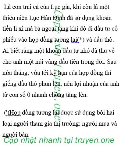 Một nhà sản xuất cần bán dầu. Họ có thể sử dụng hợp đồng tương lai làm điều đó bằng cách xác định mức giá bán, và số lượng dầu cần sản xuất sau đó cung cấp dầu cho người mua khi hợp đồng tương lai tới hạn Sau đó, Lục Hàn Đình một lần giao thiệp với thương giới, bố anh đã từng ném một số hạng mục kinh doanh kém dưới trướng Lục gia cho anh, ánh mắt anh tinh tường độc đáo, thủ đoạn sắm rền gió cuốn, mấy hạng mục này ở trong anh khoảng một tháng đã cải tử hoàn sinh, nên Lục Hàn Đình là thiên tài của thương trường, anh mười mấy tuổi đã chuyển sang dạo chơi giới thương trường rồi.