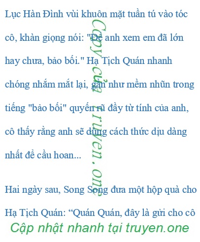 “Lục tiên sinh, ngủ thì ngủ, anh đừng có mượn chuyện ngủ làm chuyện bắt chính, anh mau buông em raI” Lục Hàn Đình hôn lên trán cô, sau đó đôi môi mỏng lướt lên đôi mắt cánh mũi, đáp xuống đôi môi mọng nước của cô: “Suyt, Lục phu nhân, đừng kêu, người bên cạnh sẽ nghe thấy đó. Truyen one chúc các bạn đọc truyện vui vẻ” Hạ Tịch Quán sợ đến mức nín thở vì tên phúc hắc vô liêm sỉ này, cô không dám cử động, cũng không dám phát ra tiếng động, chỉ có thể trợn anh bằng một đôi mắt ngắn nước.