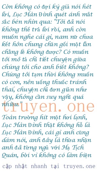 Lục Hàn Đình tiếp tục nói: “Tôi đã từ hôn với Lệ Yên Nhiên, Hạ Tịch Quán cũng từ hôn với Lục Tử Tiễn, bốn người chúng tôi đều đã là người độc thân có tự do riêng. Người đàn ông kia là tôi, về tình cảm riêng tư giữa chúng tôi, tôi không thẻ trả lời.”
