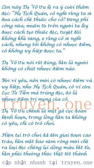 Đưa Lục Tử Tiễn đi rồi, Hạ Tịch Quán xoay người nhìn về phía Dạ Vô Ưu, cô nhếch đôi môi đỏ mọng: “Tiếp theo tôi đương nhiên phải nghĩ cho bản thân rồi, tôi cũng sợ chết, không muốn chết, nên mời Dạ thiếu đưa thuốc giải của chất độc cải đồng hoàn lão cho tôi!”