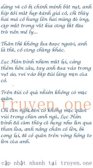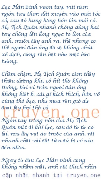 Nụ hôn vội vàng chấm đút, Lục Hàn Đình nhanh chóng giơ lên bàn tay to bao lại đầu nhỏ của cô, dịu dàng cưng chiều xoa xoa, anh chôn khuôn mặt tuần tú thật sâu trong mái tóc cô thở dốc, dùng một chất giọng đặc biệt quyến rũ, khàn khàn thấp giọng xin lỗi cô: “Quán Quán, xin lỗi.”