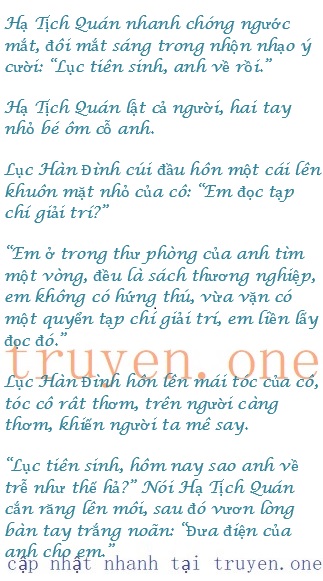Lục Hàn Đình đi vào, đóng cửa phòng lại, giơ ngón tay rõ ràng khớp xương lên cơi áo vest đặt lên trên ghế sa lon, nút áo sơ mi bên trong cũng mở hai cúc, lộ ra xương quai xanh quyến rũ, anh ngồi ở bên giường, vòng tay qua ôm cơ thể mềm mại của cô, bao cô vào trong lòng mình, anh nhìn thoáng qua sách, cô đang nhìn đọc tạp chí giải trí, còn đang đọc rất nghiêm túc chuyên chú.