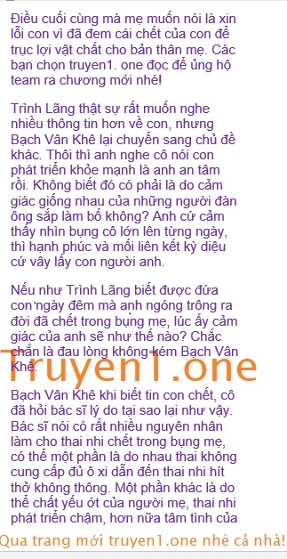 Bạch Vân Khê thật sự không thể nào tiếp tục cái chủ đề quay quanh con cái nữa, anh mà hỏi nữa, cô cũng không biết có thể tiếp tục nói dối không? Thân người làm mẹ, nhưng cô không thể bảo vệ con tốt được, để nó chết đi mà cô cũng không hay biết gì. Đó hoàn toàn là lỗi do cô, mất con cô đã quá đau lòng, nay lại tiếp tục nhắc đến cái đề tài này mà coi như chưa có chuyện gì xảy ra, cô thật là một người mẹ tồi tệ. Nếu như con có thương mẹ, thì hãy dùng cái chết của con làm một việc có ích cho mẹ. Mẹ sẽ mãi mãi không bao giờ quên con.