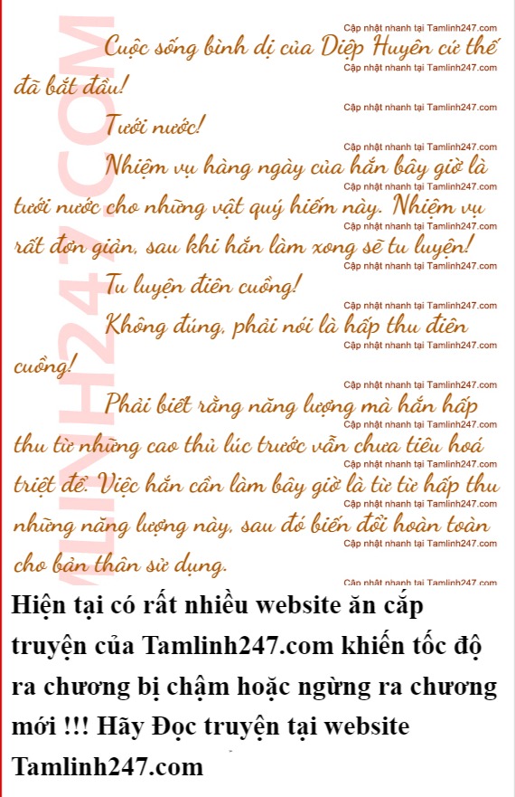 Sau nửa canh giờ, Diệp Huyên được Phong Cảnh đưa đến một khu vườn. Khu vườn này rất rộng, nó chia thành nhiều khu vực, mỗi khu vực đều được trồng nhiều loại linh quả và linh thảo khác nhau.