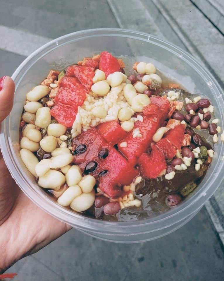 Món này nôm na là thạch rau câu, gồm có cơm rượu, các loại đậu, trái cây, để thêm đá bào.