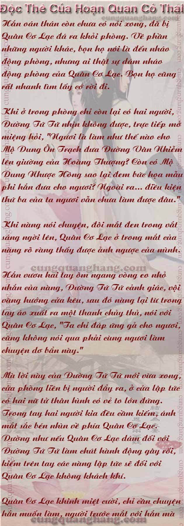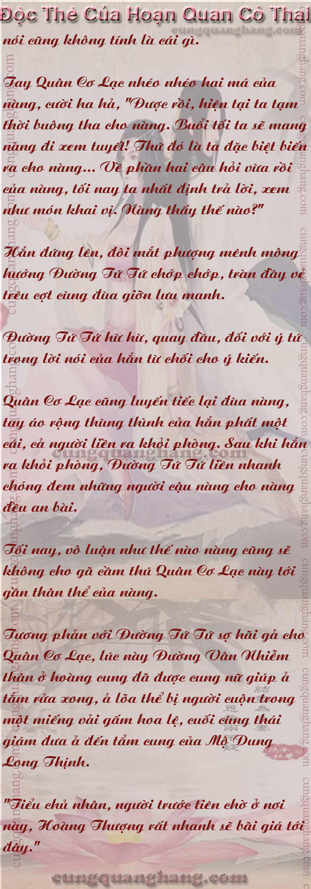 Ả dù cô đơn, tốt xấu cũng là ngủ cùng hoàng đế. Nhưng Đường Tứ Tứ, nàng ta gả cho một tên nô tài hoạn quan. Theo bản chất mà nói, Đường Tứ Tứ cũng thành nô tài.