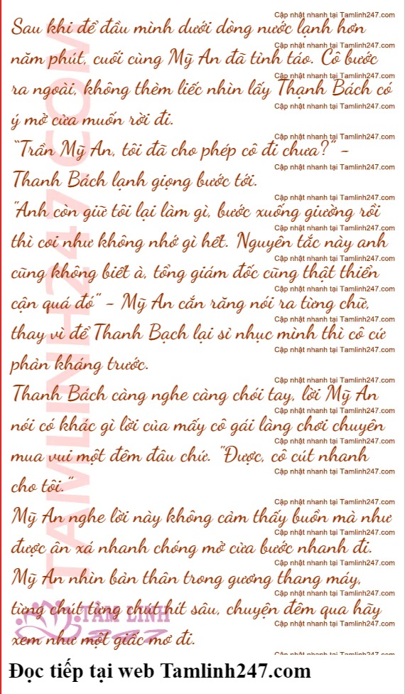 “Trần Mỹ An ơi là Trần Mỹ An, lần này mày tự hại chết mày rồi” “Đừng tỏ ra là người bị hại như thế” - Thanh Bạch bước ra từ phòng tắm, nhàn nhạt nói. Mỹ An giờ mới ý thức anh vẫn ở đây, vội lấy chăn quấn lấy bản thân như cái kén, giấu mặt không dám nhìn thẳng. “Hôm qua là ai hai chân cầu chặt không để tôi đi, giờ lại giả bộ ngây thơ rồi à?” - Thanh Bách không nhịn được trêu chọc.