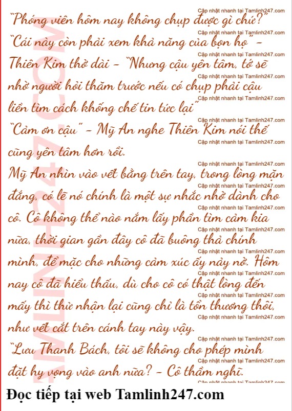 Thanh Bạch cau mày không đồng tình nhưng Mỹ An đã vội chạy vào thang máy bấm nút đóng cửa nhốt Thanh Bách ở ngoài. Dù sao cũng do Thanh Bách thu hút phóng viên, cứ để cho anh tự mình xử lý đi, cô thoát thân trước mới là quan trọng.