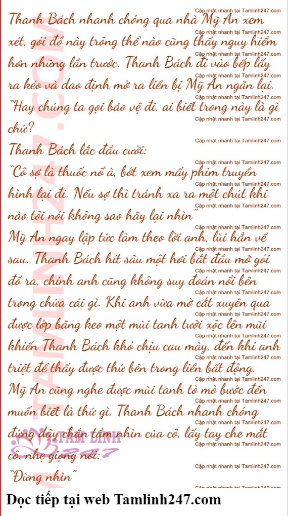 Hôm nay cuối tuần Mỹ An định ở nhà xem phim thư giãn chưa kịp nấu xong bữa sáng thì đã có chuyển phát nhanh gọi cô đến nhận bưu phẩm. Gói đồ lần này đặc biệt to, còn được quấn rát kỹ bởi ba bốn tầng băng keo. Mỹ An có linh cảm không lành thật sự, mặc dù không muốn nhưng chỉ đành mặt dày qua gõ cửa nhà Thanh Bách.