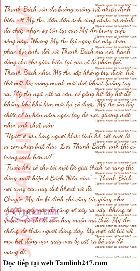 Thanh Tùng sau khi rời khỏi Bách Niên tâm trạng vẫn luôn không được tốt. Cậu kiềm chế bản thân không lại đi làm phiền Mỹ An nhưng trong lòng vẫn thỉnh thoảng nghĩ tới. Vân Anh ngoài mặt vẫn dịu dàng bên cạnh Thanh Tùng nhưng trong lòng vẫn thầm mắng sau trận lửa kia không thiếu chết Mỹ An cho rồi.