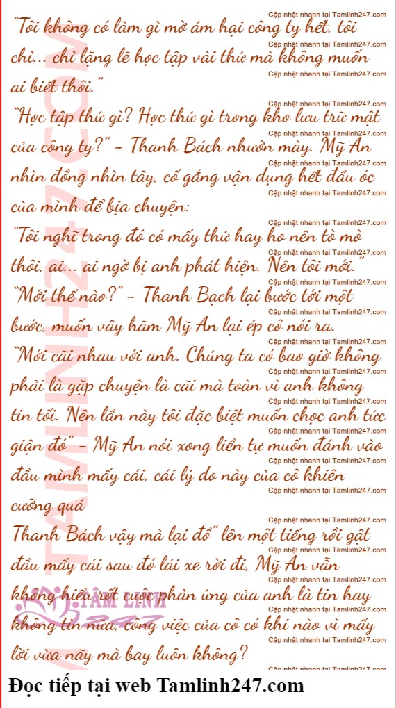 "Trần Mỹ An!” - Thanh Bách bước nhanh tới tóm lấy cô - "Tôi chỉ vừa đình chỉ cô, cô liền chạy đi tìm Thanh Tùng giúp đỡ?”