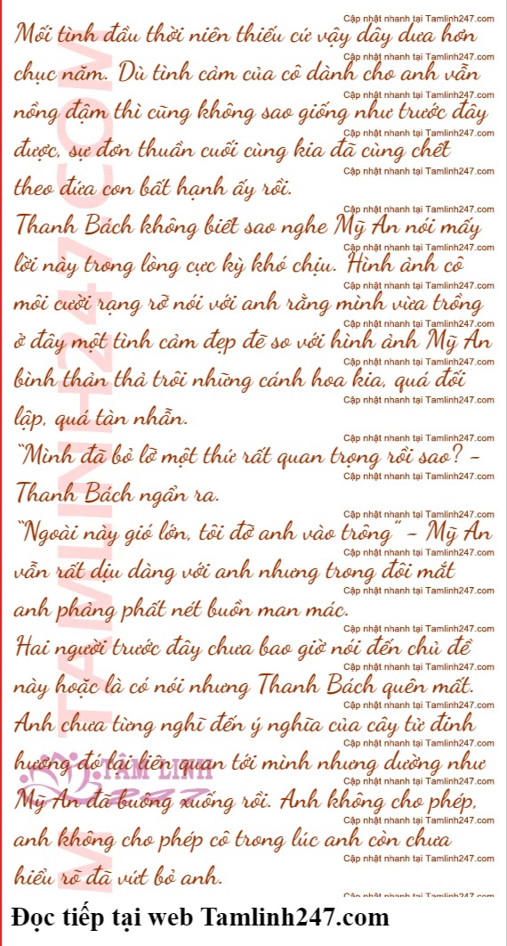 Thanh Bách thức dậy đi tìm Mỹ An nhìn thấy cô đứng dưới tán cây tử đinh hương trầm. ngâm. Anh nhớ năm đó anh cũng đứng ở đây nhìn Mỹ An đào đào xới xới trồng mầm cây đó xuống. Thanh Bách bước tới ngồi lên bậc thềm, nhẹ giọng nói: