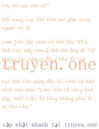Giọng điệu giễu cọt, ông nói: “Nhà họ Lục chúng tôi không nuôi con của người khác. Một triệu tệ này đủ cho ba mẹ con cô sống trong một khoảng thời gian, không phải cô vì tiền mới ở bên cạnh Hạo Thành sao? Bây giờ tôi đưa tiền cho cô, cô hãy rời khỏi Tập đoàn Lục Thị đi! “