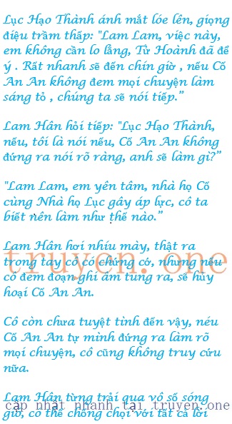 Lam Hân vừa nghe lời này, ánh mắt lóe lên, cố nén cảm giác kì lạ trong lòng : “Chuyện đó có liên quan gì đến tôi chứ? Cố An An tự làm tự chịu.”