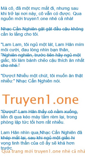 Lam hân: “Nghiên nghiên, cậu sớm nên ngủ một giấc thật ngon, nêu để bản thân mình bị suy sụp, Mộc Tử Hoành sẽ càng thêm lo lắng cho cậu, anh ấy thích cậu đến vậy, không thể chịu nổi nếu cậu chịu chút tổn thương nào, cho nên, cậu cũng phải tự chăm sóc tốt cho bản thân, chờ tình huống của Mộc Tử Hoành tốt lên, hai người có thể ở bên nhau rồi.”