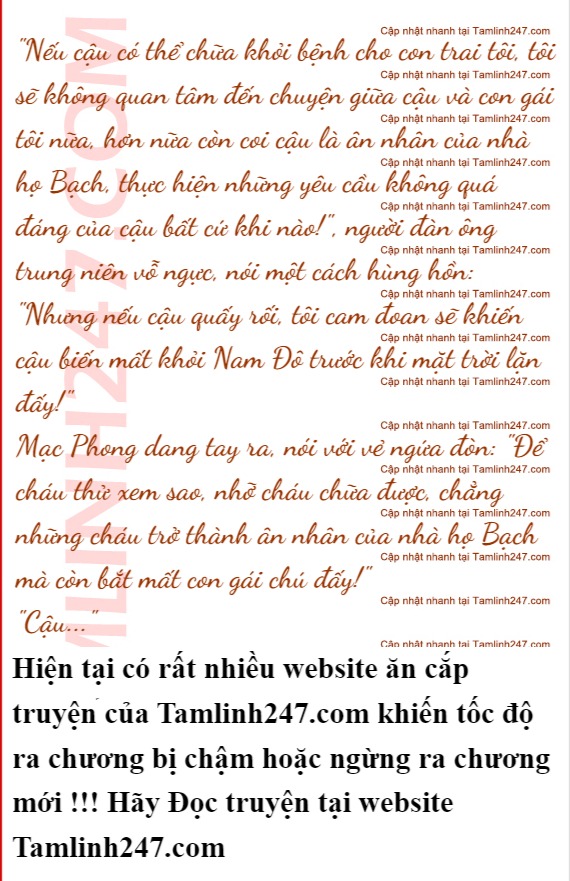 "Sao thế, chú không tin à? Nếu lát nữa cháu chữa khỏi cho con trai chú, có phải chúng ta có thể bàn chuyện cưới hỏi không?", Mạc Phong cười gian.