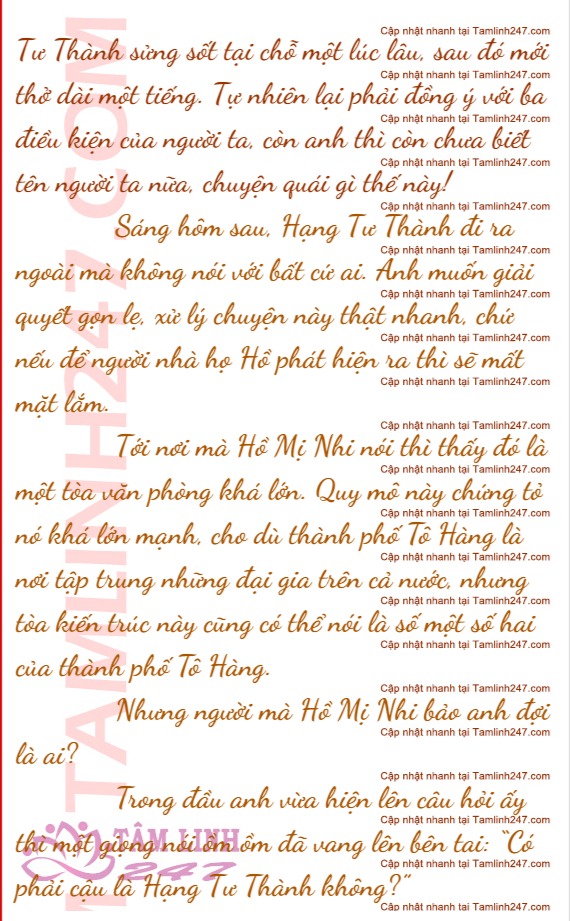 Hạng Tư Thành không giấu diếm, anh nói ra tên mình. Sau đó, Hồ Mị Nhi nhẹ nhàng đọc tên một địa chỉ: “Chuyện thứ nhất là ngày mai phải tới nơi ấy, đến lúc đó sẽ có người nói cho anh biết phải làm thế nào”.
