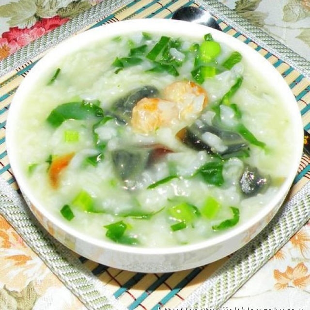 Trong cháo cũng có các loại rau xanh thái nhỏ và còn có nêm thêm chút gia vị muối, ăn vào miệng có vị mằn mặn.