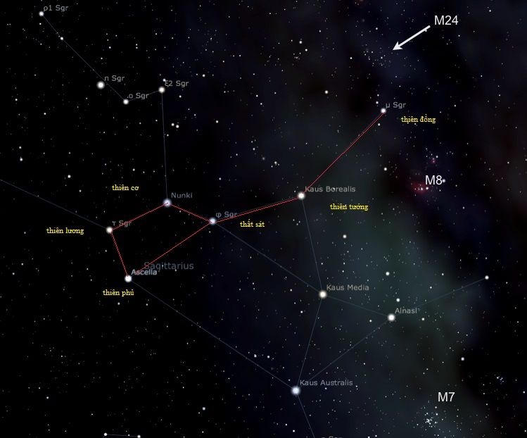 [3] Nam Đẩu: Người Trung Quốc cổ đại xếp chòm sao này vào Nhị thập bát tú và theo thần thoại Trung Hoa, có 6 vị thần tương ứng với 6 ngôi sao chòm Nam Đẩu này, và gọi chung là Nam Đẩu tinh quân, hay là Nam Tào (đừng nhầm lẫn với sao Nam Tào) bao gồm Thất Sát tinh( hoặc Thất Sát tinh quân), Thiên Tướng tinh, Thiên Đồng tinh, Thiên Cơ tinh, Thiên Lương tinh, Thiên Phủ tinh.