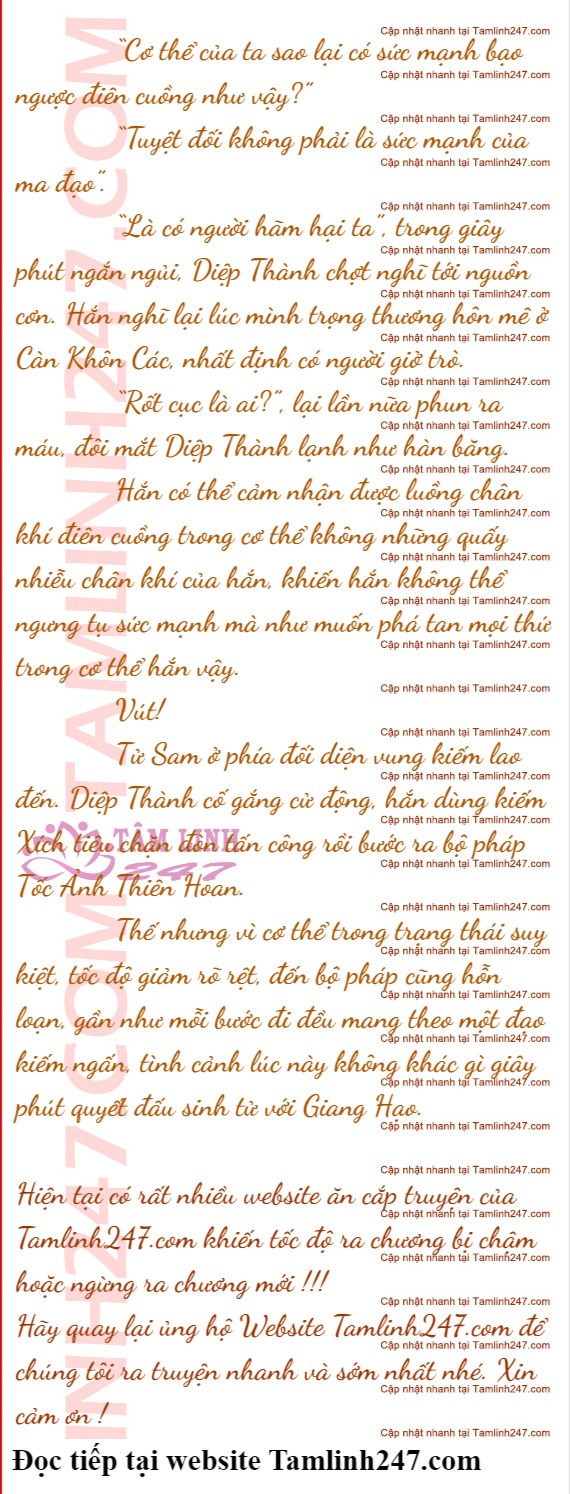 Trong lúc mọi người đang chưa hết bàng hoàng thì Diệp Thành lại phun ra máu lần nữa, luồng chân khí trong cơ thể hắn đã xông phá đứt một đường kinh mạch, đến cả xương cốt cũng không thể trụ được nên bị đứt mất vài đoạn, và nguy hơn đó là vì luồng chân khí này nên chân khí toàn thân của hắn hỗn loạn, rất khó ngưng tụ.