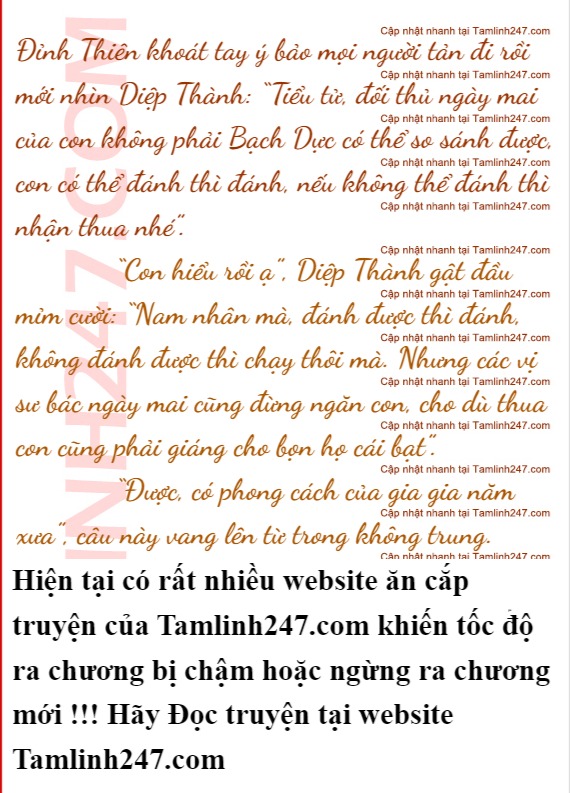 “Chính Dương tông chủ, ông vẫn nên quan tâm đến đệ tử của mình thì hơn”, Diệp Thành không hề kiêng dè, hắn nhìn thẳng Thành Côn chẳng hề e sợ, cười lạnh lùng: “Hy vọng ngày mai gặp lại các đệ tử của Chính Dương Tông vẫn còn đánh hăng được như hôm nay, nếu như bị ta đánh thảm bại thì ông đừng trách nhé”.
