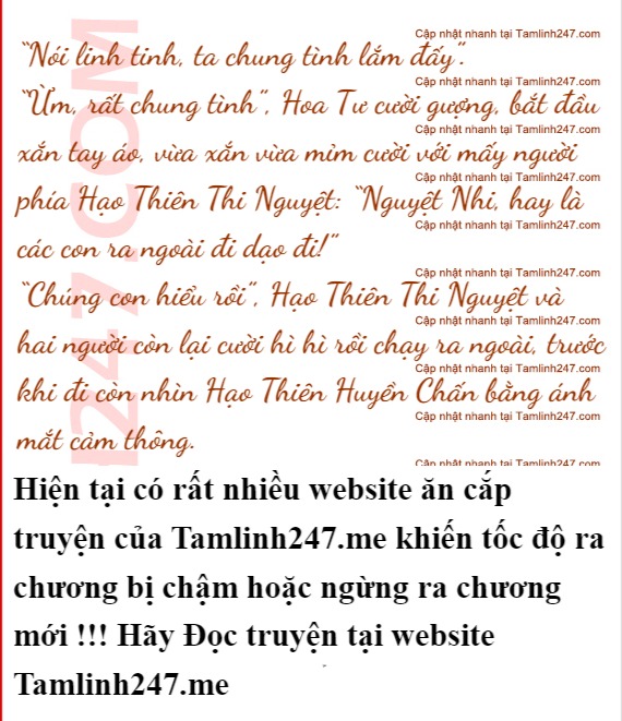 “Cha à! Xem ra thời trẻ cha rất trăng hoa!”, mấy người phía Hạo Thiên Thi Nguyệt nhìn vẻ mặt rối rắm của Hạo Thiên Huyền Chấn, bất giác che miệng cười trộm: “Chưa biết chừng chúng con không chỉ có một đệ đệ hay ca ca ấy chứ”.