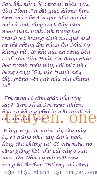 Cô ấy hình như đã phát hiện ra điều gì đó, liền nói: “Chị Hoài An, chị xem! Cách thêu của bức tranh này giống hệt như cách thêu trên ví tiền của chị vậy”