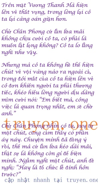 Vương Thanh Hà thấy Chử Chấn Phong nghe mình nói xong thì vẻ mặt trở nên lạnh lẽo như băng, khiến người ta không thể nhìn thấu tâm tư của anh. Cô ta cũng không dám suy đoán lung tung, thế là dứt khoát bỏ qua đề tài này, nói: “Chấn Phong, gân đây bố mẹ em cứ hỏi về chuyện kết hôn của chúng ta mãi, lúc trước anh đã nói là đợi đến khi anh tiếp nhận Tập đoàn Chử Thị và xử lý xong xuôi hết mọi việc thì chúng ta sẽ tổ chức hôn lễ…”