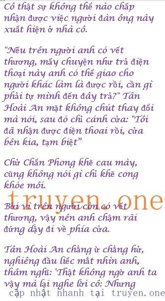 Thế nhưng Chử Chấn Phong không định cứ cho qua như thế, anh không cam lòng hỏi lại bằng cách khác: “Vậy vết thương trên đùi tôi có liên quan gì tới cô hay không?”