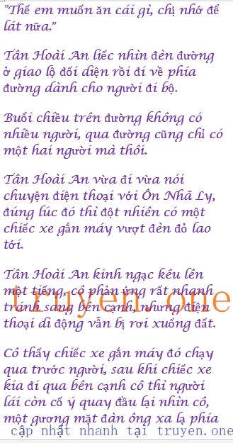 Tân Hoài An tỉnh táo lại, cô bước nhanh tới đường cái đối diện rồi nói: “Không có chuyện gì đâu, vừa nãy chị suýt chút nữa bị một chiếc xe máy vượt đèn đỏ va vào”