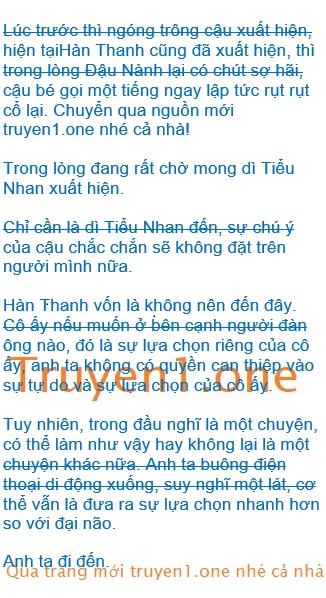 Mà Đậu Nành sau khi nghe được đối phương nói mình là đối tượng sẽ kết hôn của dì Tiểu Nhan, cậu ngay lập tức tỏ ra bàng hoàng, đưa tay lên che kín miệng mình. Một hồi lâu mới chịu buông tay ra, sau đó thè lưỡi với Lý Tư Hàn nói: “Thực xin lỗi chú, Đậu Nành đã có lời nói không đúng, dì Tiểu Nhan thật sự là không thích cậu của cháu dù chỉ một chút, dì về sau cũng sẽ không có say rượu trộm hôn cậu của cháu, còn ở lại trong nhà cậu cháu A!”