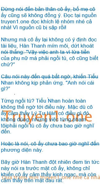 Tay cô ấy siết lại rồi thả ra, thả ra rồi lại siết chặt, cuối cùng ngẩng đầu lên nhìn anh ta. “Vậy thì sao?”Hàn Thanh mím môi không nói gì nhìn cô ấy, đợi những lời tiếp theo của cô ấy. “Cho dù anh ta đã từng ngồi tù, thì làm sao?”