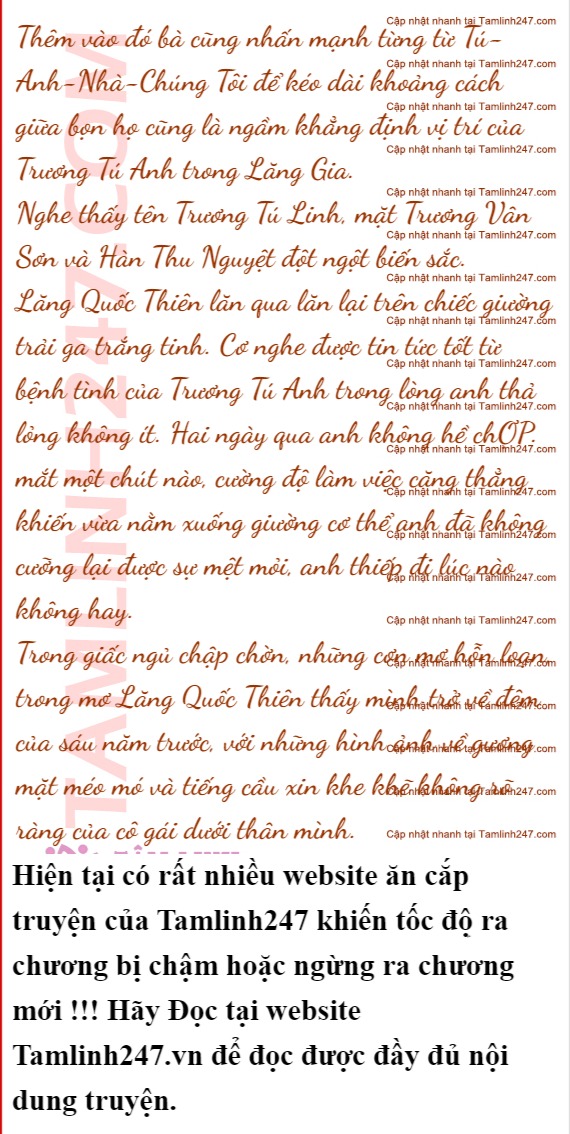 “Hôm nay tôi mời ông bà thông gia tới đây, một mặt là báo cho ông bà biết về tình trạng của Tú Anh, dù sao cũng là con gái của ông bà đã sinh ra, ông bà có quyền được biết tình trạng của con bé. Nhưng điều đó không đồng nghĩa với việc chúng tôi cần ở ông bà thông gia bất kỳ trách nhiệm chăm sóc nào.Việc này sẽ do Lăng Gia đảm nhiệm. Mặt khác tôi cũng xin được khẳng định một điều, Lăng gia chúng tôi sẽ bằng mọi giá tìm ra kẻ đã hãm hại Tú Anh và khiến kẻ đó trả giá. Những gì Tú Anh phải chịu hôm nay kẻ đó sẽ phải chịu gấp trăm gấp nghìn lần hơn thế, dù kẻ đó có là bất kỳ ai.”