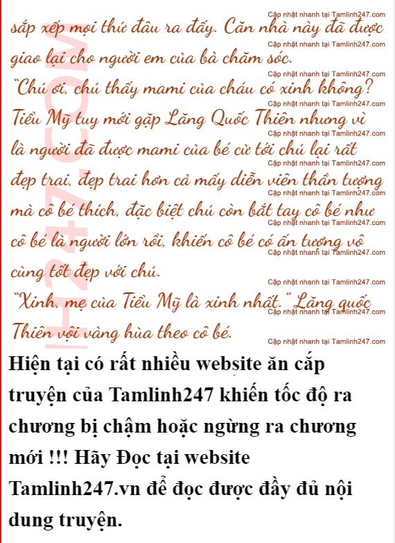 “Chào Tiểu Mỹ, chú là Lăng Quốc Thiên. Chú tới đón cháu và bà về với mẹ.” Lăng Quốc Thiên cúi người, đưa tay ra bắt tay Tiểu Mỹ. Cô bé ngước đôi mắt tròn xoe lên nhìn vú Từ chờ sự đồng ý của vú, sau khi nhận được cái gật đầu từ bà cô bé liền đưa bàn tay bé xíu, trắng mũm míp ra thẳng lưng bắt tay Lăng Quốc Thiên.