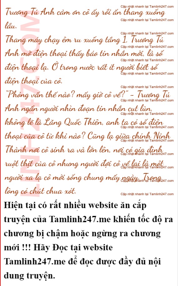 Thịnh Thiên Vĩ không nói không rằng đưa tay bấm điện thoại, tiếng rì rì rung lên trong túi Trương Tú Anh. Cô cố tình không nghe.