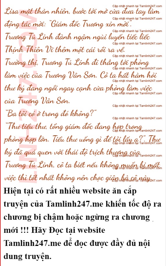 “KHông giấu gì THịnh tổng khu đất đó còn vướng chút thủ tục về quyền thừa kế, anh yên tâm Trương Thị sẽ giải quyết được” - Trương Tú Linh cũng khá thông mình, tình hình mảnh đất đó không phải cô ta không rõ. Trước khi về hưu, vào núi ở ẩn ông nội cô ta giao hết sản nghiệp cho Trương Vân Sơn toàn quyền quyết định, chỉ riêng mảnh đất phía nam, cái hoang mạc khỉ ho cò gáy ấy ông nội cô ta lại nhất quyết rằng về sau muốn sử dụng phải được sự đồng ý của Trương Tú Anh - cô cháu gái cưng của ông. Trương Vân Sơn và Trương Tú Linh vốn định lờ đi, vì đây là lời nói chứ không có văn bản.Vậy mà Thịnh Thiên Vĩ cũng tìm hiểu ra được. Trương Tú Linh tranh thủ ngắm nhìn anh ta, quả là cực phẩm, dáng người rắn chắc như người mẫu, gương mặt đẹp không góc chết, ánh mắt mê hoặc lòng người, làn môi mỏng quyến rũ. Điều quan trọng là anh ta rất giàu có, giàu có hơn bất kỳ ai ở Ninh Thành.