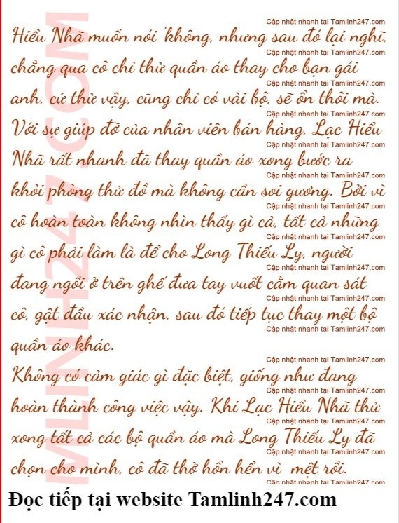 "Đợi một tí, ở đây có trang phục phù hợp với mẹ, để mẹ mặc thử đã." Tân Vinh đang hết sức vui vẻ chọn quần áo. Bà ta vừa nhìn thấy Long Thiếu Ly chọn quần áo cho Lạc Hiểu Nhã nên bà ta cũng thuận tay chọn vài món. Dù sao cũng có người trả tiền mà, thật tốt biết bao.